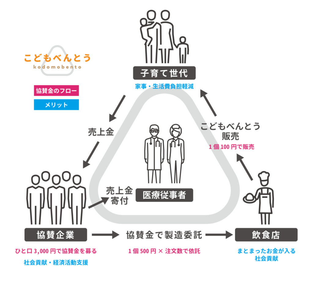 こどもべんとうは、おにぎりのような三角形のサイクルで地元企業が協力し、社会全体でこどもたちを育て、飲食店への経済活動の協力を行うことが目的です。